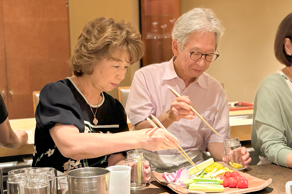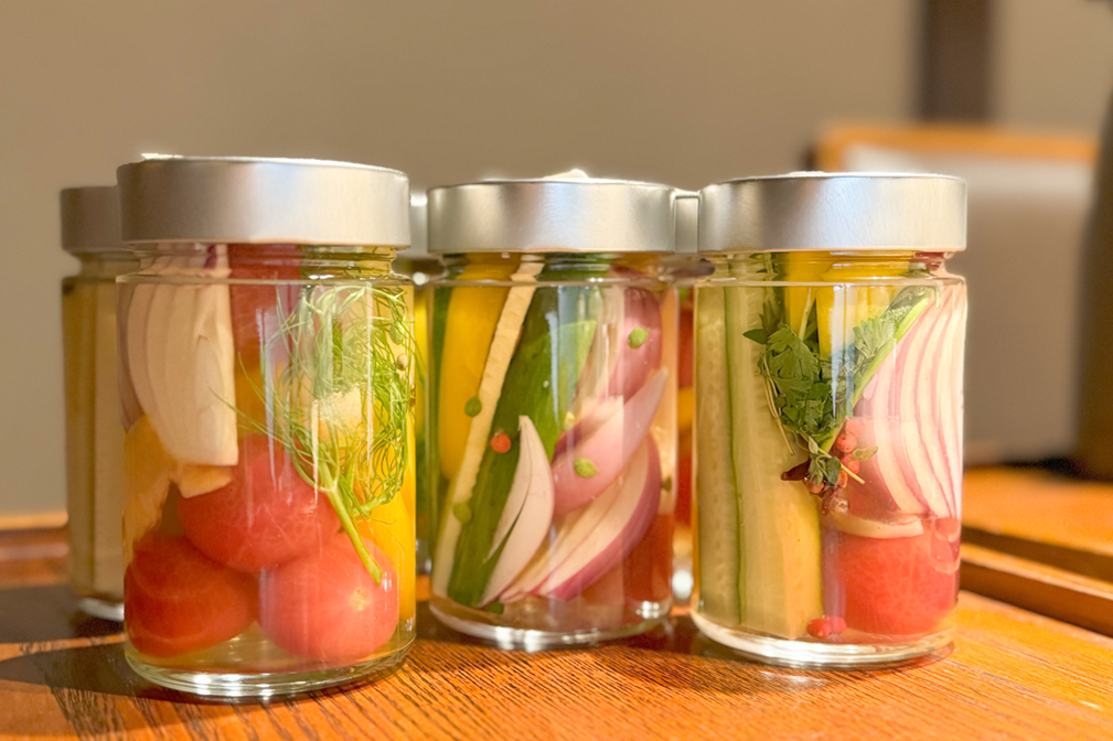 彩り豊かな夏野菜とお好みでハーブとスパトスを瓶に詰め、ご自身で選んだお酢で作ったピクルス液を注いでいただきます。完成したピクルスはお持ち帰りいただきました。