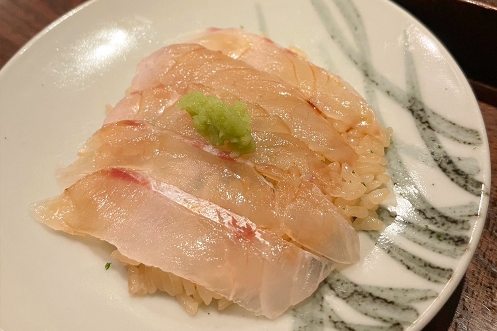 続いては、千鳥酢・赤酢・富士酢、それぞれのすし酢を土鍋で炊いたごはんと混ぜ合わせ、三種類の酢飯を作ります。お酢の味の違いを感じながら食べ比べていただき、お好きな酢飯 ひとつ選んで、鯛の黒寿しにしてお召し上がりいただきました。